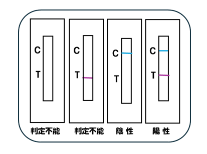 インフルエンザの迅速検査のようにいわゆるデバイスを用いる方法では、コントロールのラインの出現が必須で、これを確認してからテストライン、つまり検体の検査結果となるラインの確認を行います。多くの場合、うっすらでもラインが見えれば「陽性」と判定します。