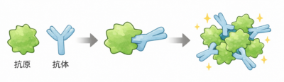 赤血球やラテックス粒子の表面に抗原または抗体を感作(吸着)し、検体中の対応する抗原または抗体と反応させて凝集塊を作り、検出する方法です。
